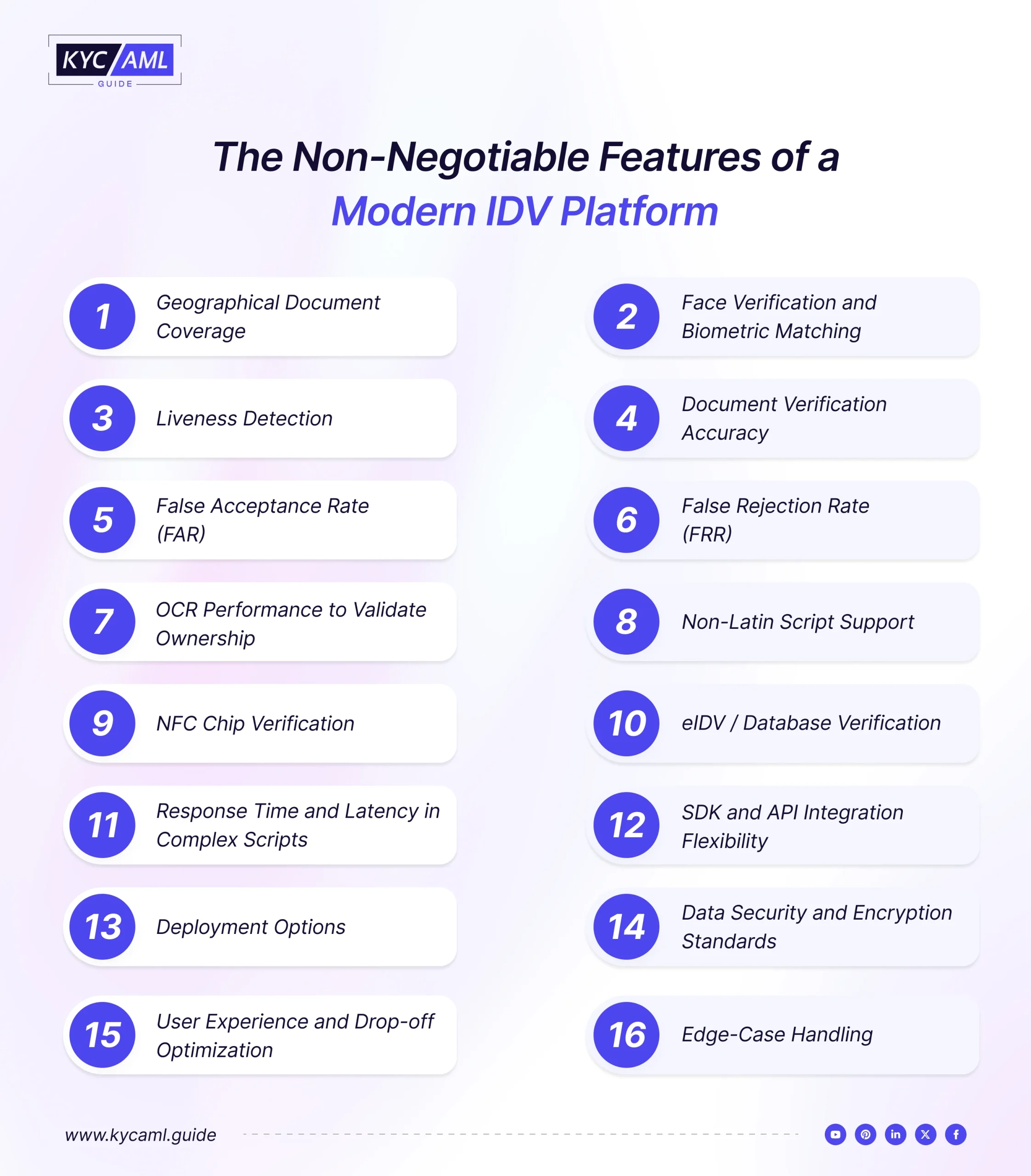 After strategy alignment is established, you will need to verify that the vendor candidates’ identity verification stack contains operational depth.This checklist is strictly focused on IDV capabilities; it does not take into account broader AML or compliance capabilities and is concerned with the technical capabilities that play a direct role in reducing fraud, increasing conversion rates, and providing long-term scalability.